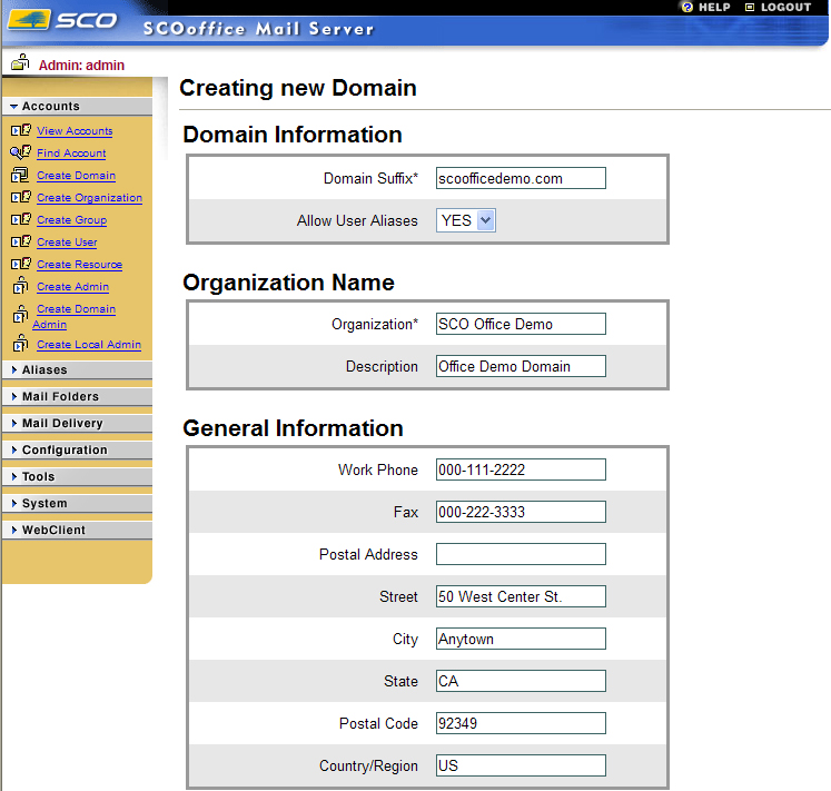 Administrators may create new virtual domains. To create a new domain, type the domain name and description in the appropriate fields and click Create.
